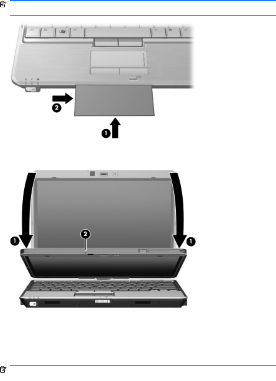 4. Baixe lentamente o ecrã(1) até que a luz da câmara Web (2) pare de piscar e oiça um som, que