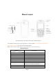 Phone Layout Harness hole Earpiece Speaker Recharge jack Mic Screen Main menu Game Calling key Earphone jack SMS Contact list Recent calls Power on/off Audio profiles Standard keypad Phone Bottom Side、Back Side and Front Side Schematic Diagram This handset has totally 20 keys on the keypad. It has 1.4 inches FSTN (or CSTN with maximum 4K colors for colorful display product) screen. Also it has a recharge interface.
