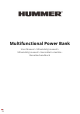 PRODUCT LAYOUT: LED light Power button Battery Indicator light Micro USB 5V/2A Input port Jump starter socket USB5V/2A Output port Sparkless Smart Cable 2A Car Adapter Micro USB cable PARTS LIST: # 1 2 3 4 Parts Name Hummmer Multifunctional Power Bank Micro USB cable 2A Car adapter Sparkless Smart Cable Qty 1 # 5 Parts Name User Guide Qty 1 1 1 1 BATTERY CAPACITY INDICATOR LIGHTS: Press the Power Button lightly to check the remaining battery level.