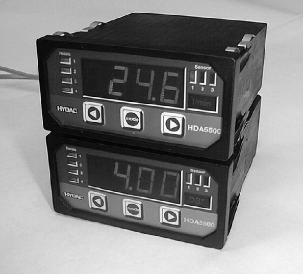 HDA 5500 for HLB 1000 and CS 1000 4 Operating keys 4-digit digital display LED display of active switching points Sensor Relais 1 2 LED display of active sensor 1 2 3 3 % 4 MODE HDA5500 Display of unit of measurement sensor 1, 2, 3 or 4 Keys for adjusting the switching points, switch-back points and the menu functions 5 Selection and display of the unit of measurement The operator can select the appropriate unit label from a printed sheet and this is then displayed with background lighting.
