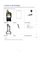 1. Items in the Package Please unpack carefully and check that all items listed below are received. If any item is missing or damaged, please contact your dealer. Radio Unit Battery Power Adapter Belt Clip Strap Documentation Kit Warning .1. Please keep distance of 25mm from the body, when speaking.