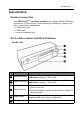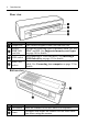 6 Introduction Rear view No. Name 1 2 Output slot SD/xD/ MMC/MS card slot 3 USB socket 4 Mini USB socket Function/description The scanned original comes out from this slot. Accepts the following types of memory cards: SD, xD, MMC and MS. See Supported memory card types on page 16 for details. For connecting a USB flash drive. See Inserting a USB flash drive on page 13 for details. For connecting the scanner to a computer via the USB cable. See Connecting to a computer on page 12 for details.