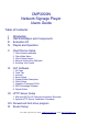 CMP2000N Network Signage Player Users Guide Table of Contents: I. Introduction II. CMP2000NSpec and Components III. Evaluation Kit IV. Playlist and Operation V. Client Device Setup 1. 2. 3. 4. 5. Client board Installation Client Main Menu Client Setup Screen Remote Control Key Definition Scrolling Text Format VI. CAT Software 1. 2. 3. 4. 5. 6. 7. 8. 9. CAT.exe Tools Tab Account Sever Setup Playlist Editor Description Client Setup Graphics Command ICON: RSS Advantage Software Playlist Editor VII.
