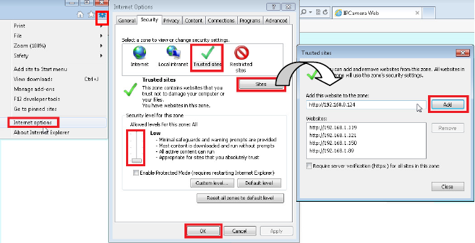 the bar to “Low”. Click “ Sites “ to add the trusted site for this IP camera. Please refer to the