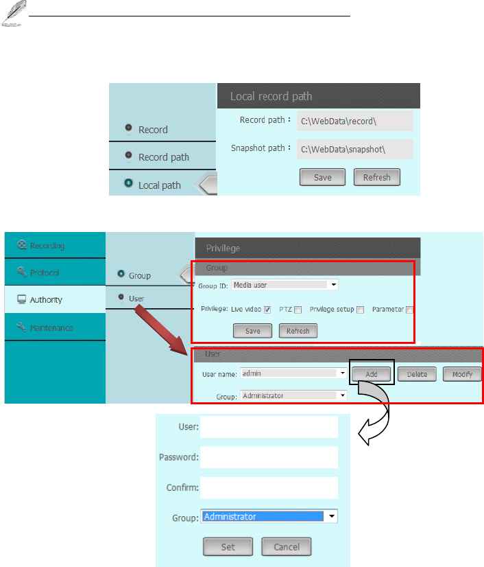 Local path: Setup the saving path of video clips and snapshot on the PC which connect this