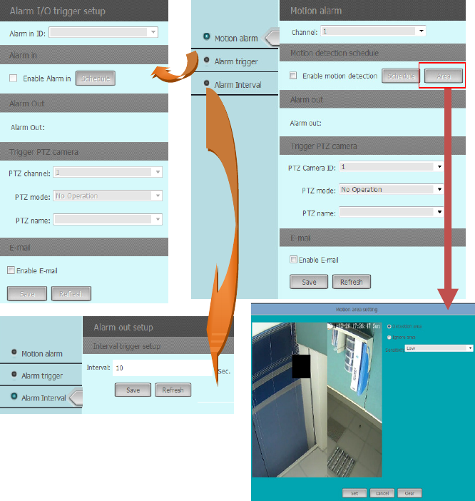 Alarm trigger: The alarm trigger almost same as Motion alarm, please refer the description of