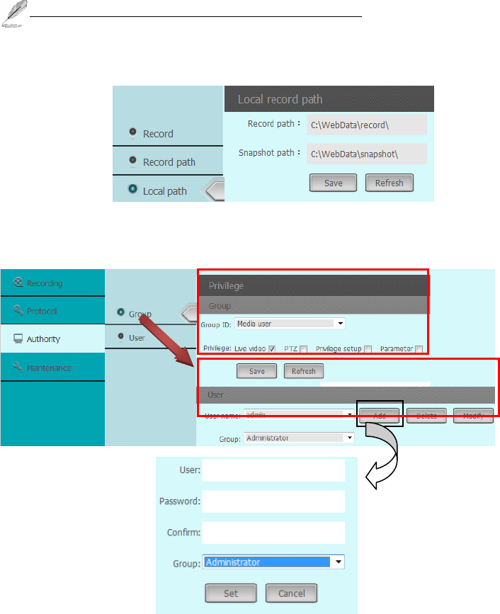 Local path: Setup the saving path of video clips and snapshot on the PC which connect this