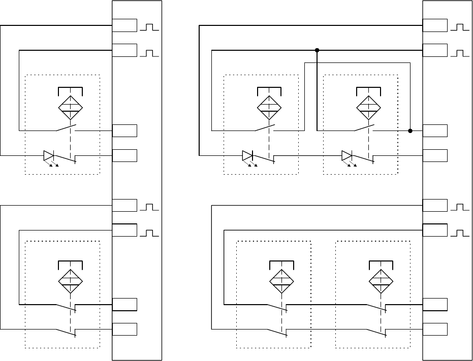 Same terminals functioning as dual channel direct opening inputs can be connected it in the case of another logic.
