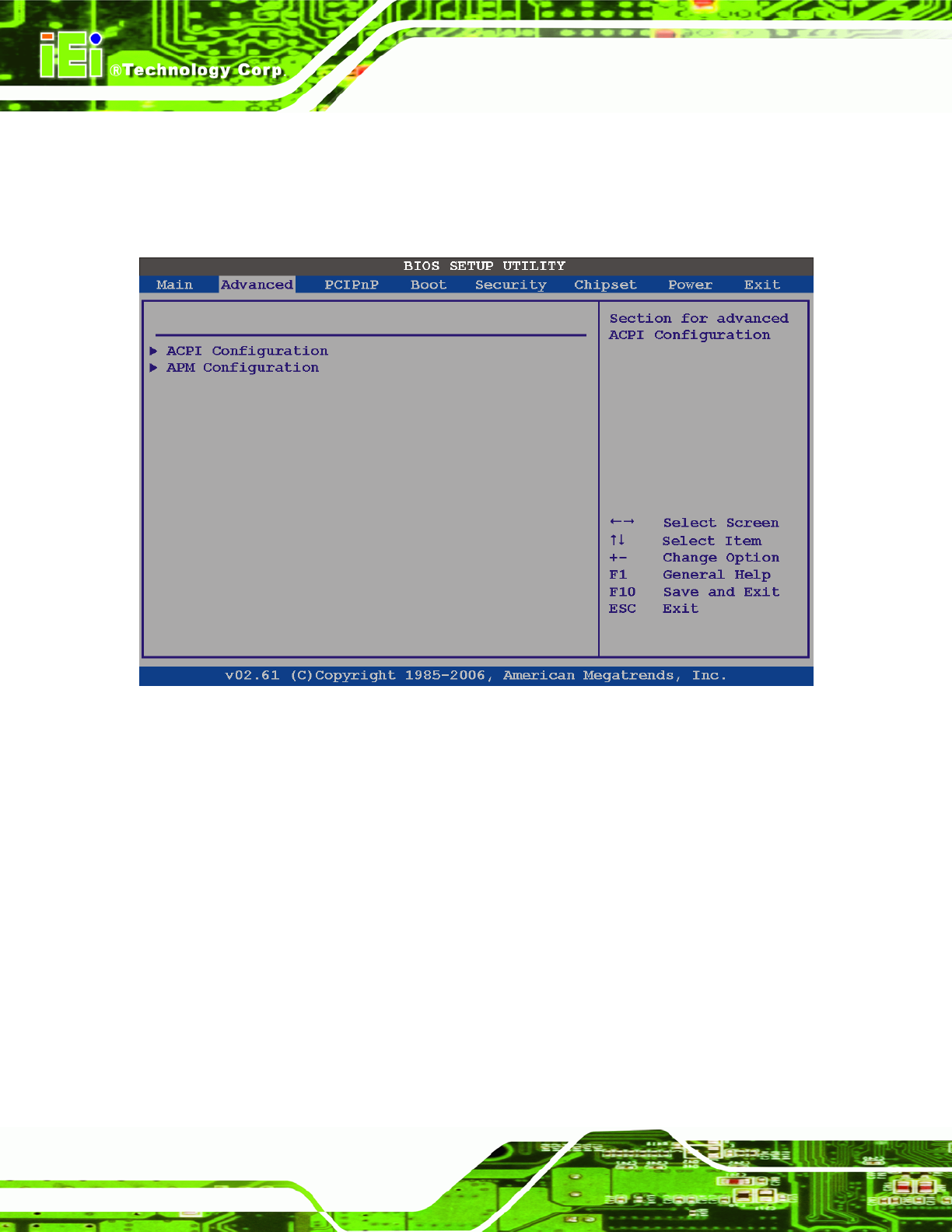 The Power Configuration menu (9BIOS Menu 8) configures the Advanced Configuration