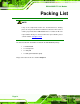 IEM-945GSE ETX 3.0 Module 3.3 Unpacking Checklist NOTE: If some of the components listed in the checklist below are missing, please do not proceed with the installation. Contact the IEI reseller or vendor you purchased the IEM-945GSE from or contact an IEI sales representative directly. To contact an IEI sales representative, please send an email to sales@iei.com.tw. 3.3.