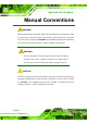 IEM-LX-800 ETX CPU Module Manual Conventions WARNING! Warnings appear where overlooked details may cause damage to the equipment or result in personal injury. Warnings should be taken seriously. Warnings are easy to recognize. The word “warning” is written as “WARNING,” both capitalized and bold and is followed by text. The text is the warning message. A warning message is shown below: WARNING: This is an example of a warning message.