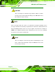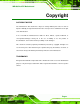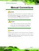 IMB-Q354 uATX Motherboard Manual Conventions WARNING! Warnings appear where overlooked details may cause damage to the equipment or result in personal injury. Warnings should be taken seriously. Warnings are easy to recognize. The word “warning” is written as “WARNING,” both capitalized and bold and is followed by text. The text is the warning message. A warning message is shown below: WARNING: This is an example of a warning message.