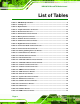 IMB-Q670 Micro-ATX Motherboard List of Tables Table 1-1: IMB-Q670 Specifications..............................................................................................8 Table 2-1: Packing List.................................................................................................................12 Table 2-2: Optional Items.............................................................................................................13 Table 3-1: Peripheral Interface Connectors ................