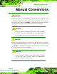 IMBA-XQ354 Motherboard Manual Conventions WARNING! Warnings appear where overlooked details may cause damage to the equipment or result in personal injury. Warnings should be taken seriously. Warnings are easy to recognize. The word “warning” is written as “WARNING,” both capitalized and bold and is followed by text. The text is the warning message. A warning message is shown below: WARNING: This is an example of a warning message.