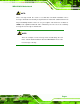 IMBA-XQ354 Motherboard Manual Conventions WARNING! Warnings appear where overlooked details may cause damage to the equipment or result in personal injury. Warnings should be taken seriously. Warnings are easy to recognize. The word “warning” is written as “WARNING,” both capitalized and bold and is followed by text. The text is the warning message. A warning message is shown below: WARNING: This is an example of a warning message.