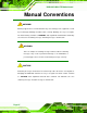 KINO-9453 Mini-ITX Motherboard Manual Conventions WARNING! Warnings appear where overlooked details may cause damage to the equipment or result in personal injury. Warnings should be taken seriously. Warnings are easy to recognize. The word “warning” is written as “WARNING,” both capitalized and bold and is followed by text. The text is the warning message. A warning message is shown below: WARNING: This is an example of a warning message.