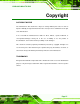 KINO-9652 Mini-ITX SBC Copyright COPYRIGHT NOTICE The information in this document is subject to change without prior notice in order to improve reliability, design and function and does not represent a commitment on the part of the manufacturer. In no event will the manufacturer be liable for direct, indirect, special, incidental, or consequential damages arising out of the use or inability to use the product or documentation, even if advised of the possibility of such damages.