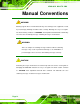 KINO-9652 Mini-ITX SBC Manual Conventions WARNING! Warnings appear where overlooked details may cause damage to the equipment or result in personal injury. Warnings should be taken seriously. Warnings are easy to recognize. The word “warning” is written as “WARNING,” both capitalized and bold and is followed by text. The text is the warning message. A warning message is shown below: WARNING: This is an example of a warning message.