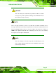 KINO-9652 Mini-ITX SBC Manual Conventions WARNING! Warnings appear where overlooked details may cause damage to the equipment or result in personal injury. Warnings should be taken seriously. Warnings are easy to recognize. The word “warning” is written as “WARNING,” both capitalized and bold and is followed by text. The text is the warning message. A warning message is shown below: WARNING: This is an example of a warning message.