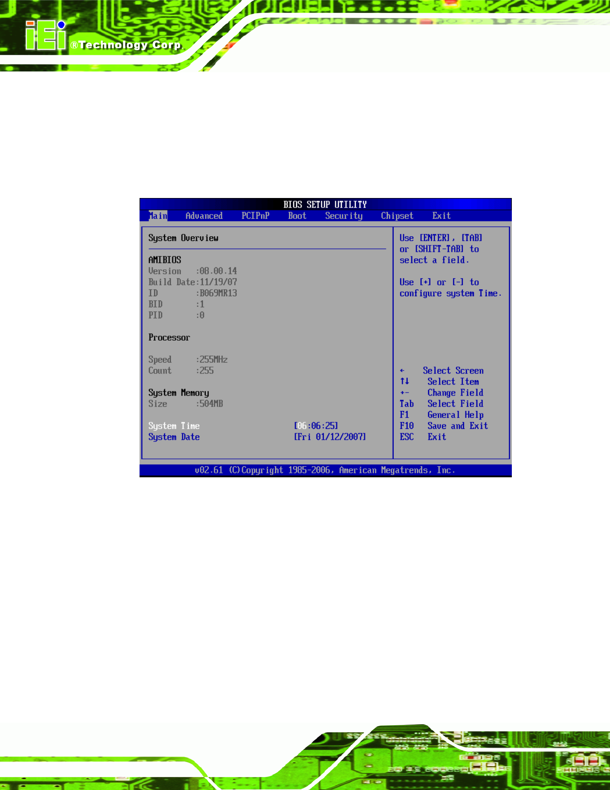 The Main BIOS menu (BIOS Menu 1) appears when the BIOS Setup program is entered.