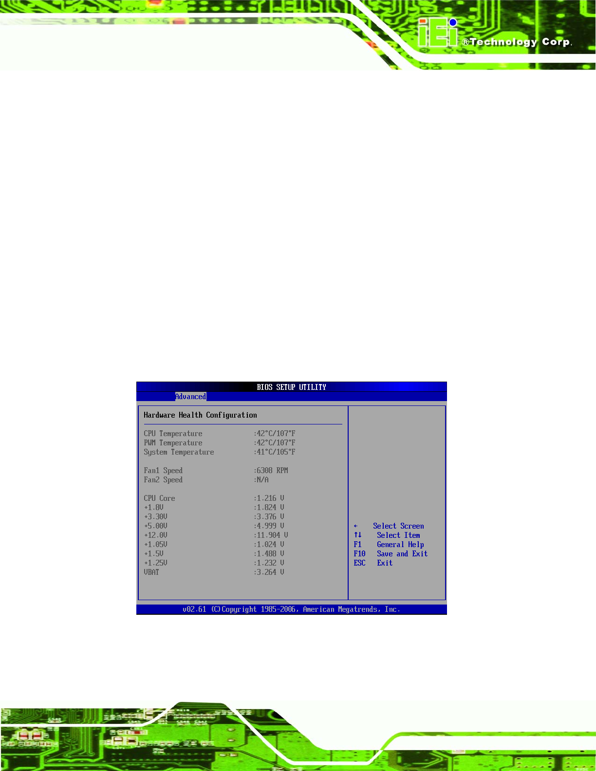 The Hardware Health Configuration menu (BIOS Menu 7) shows the operating