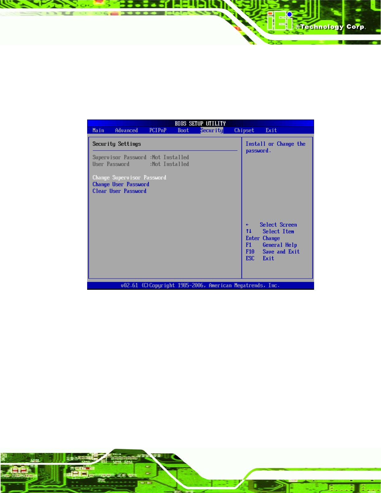 Use the Security menu (BIOS Menu 22) to set system and user passwords.