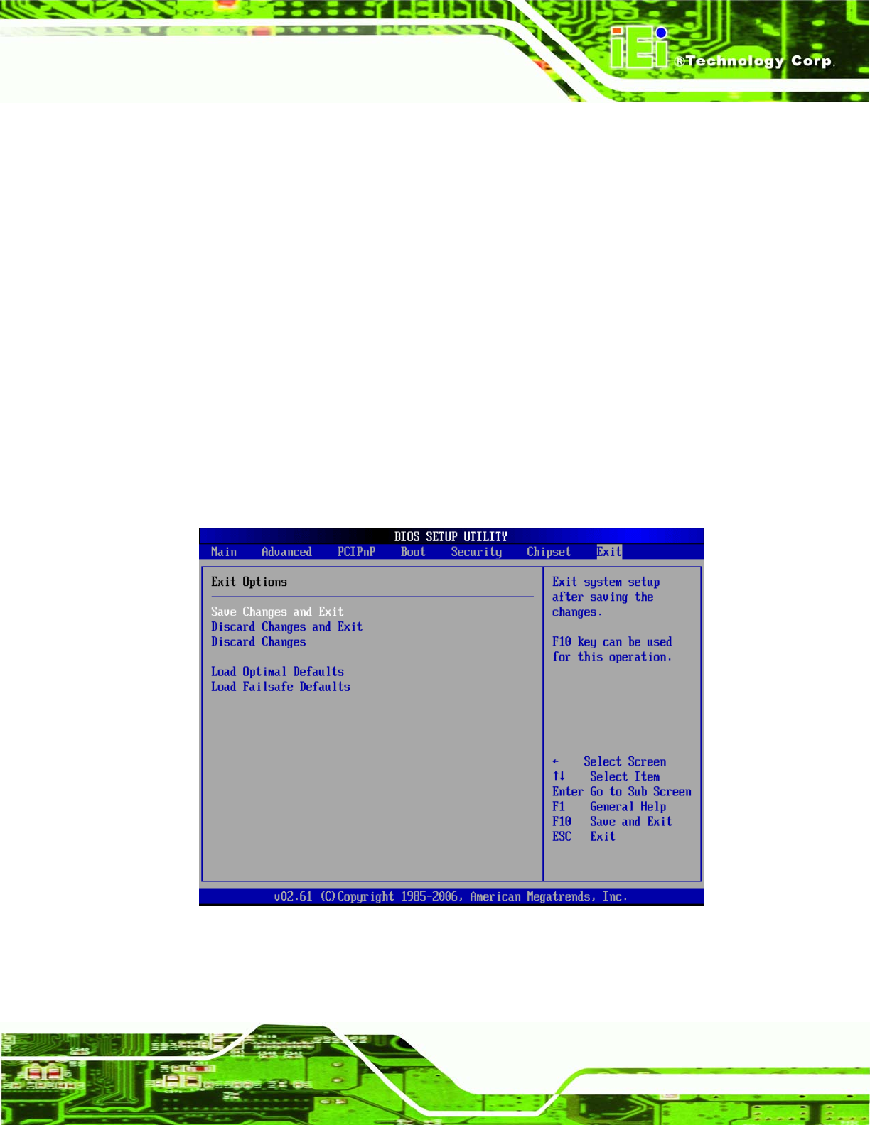 Use the Exit menu (BIOS Menu 26) to load default BIOS values, optimal failsafe values
