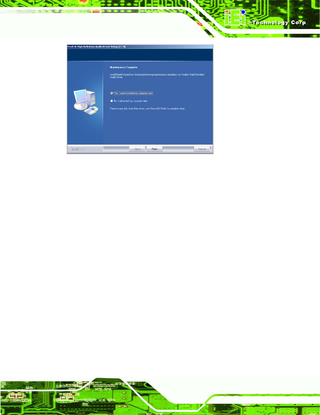 Step 14: The confirmation screen offers the option of restarting the computer now or later.