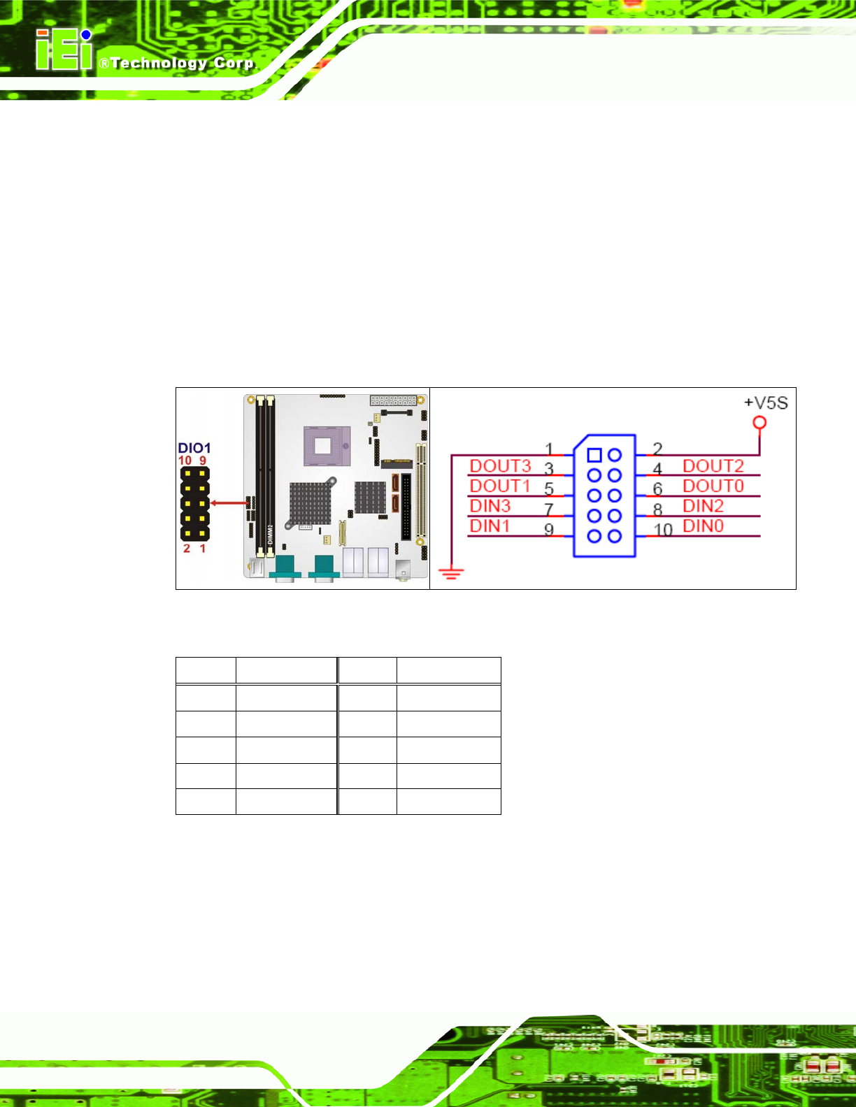 The DIO connector is managed through a Super I/O chip. The DIO connector pins are