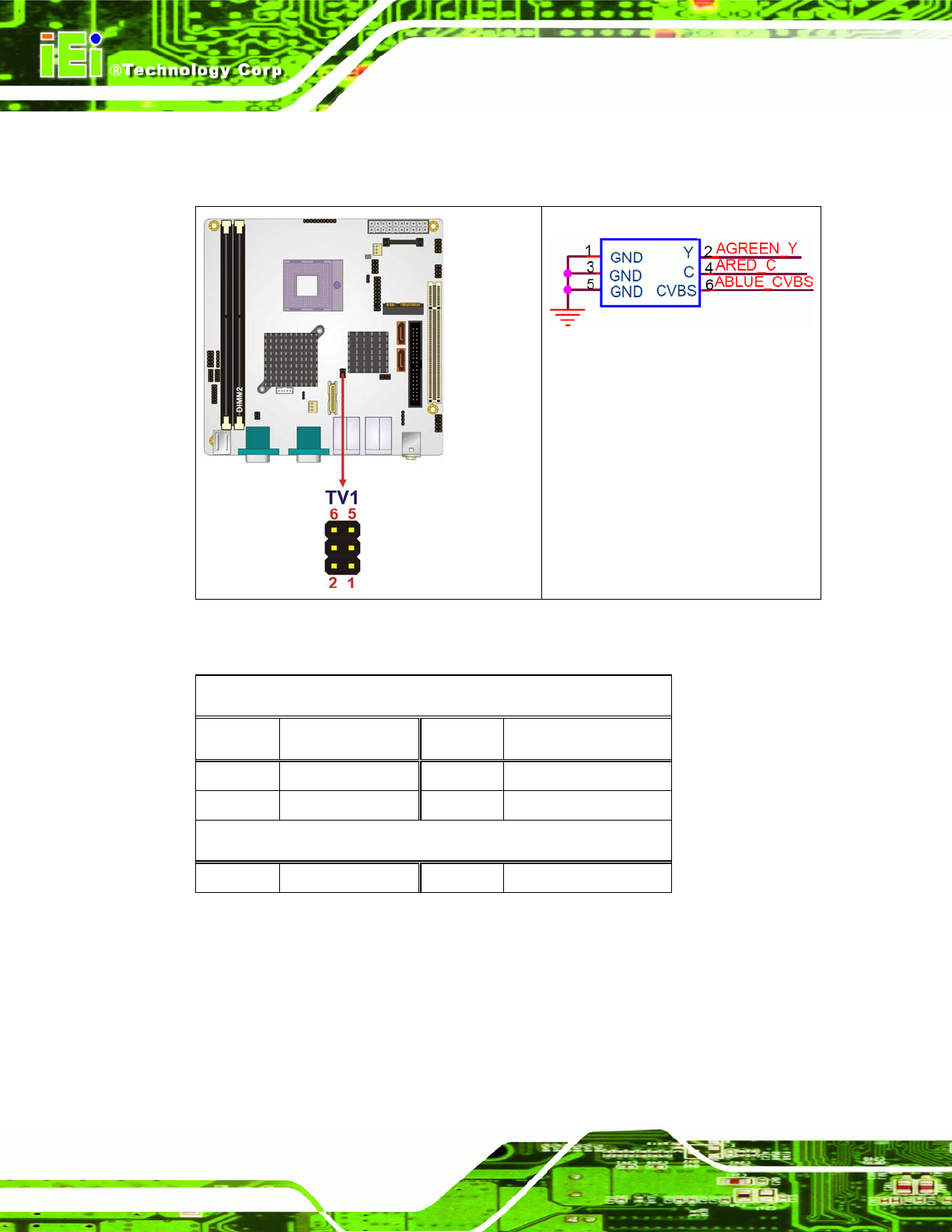 The 2x3 pin TV out connector connects to a TV output by using an S-Video or RCA