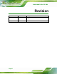 KINO-DQM871 Mini-ITX SBC Revision Date Version Changes 22 April, 2014 1.01 Modified Table 3-32: LAN2 Pinouts and Table 3-35: LAN1 Pinouts 30 August, 2013 Page ii 1.