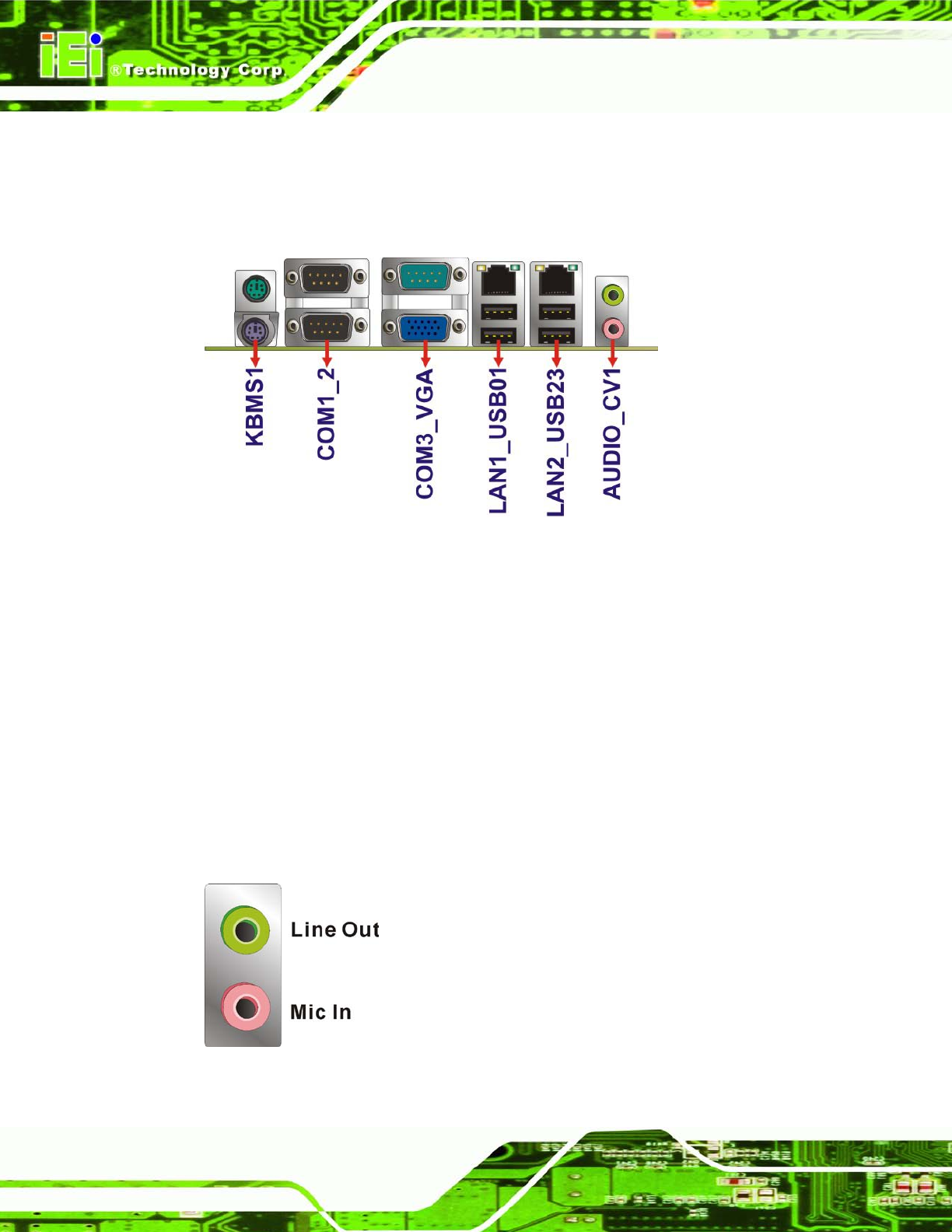 Line Out port (Lime): Connects to a headphone or a speaker. With
