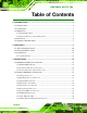 KINO-GM45A Mini-ITX SBC List of Tables Table 1-1: Technical Specifications..............................................................................................8 Table 3-1: Peripheral Interface Connectors ...............................................................................17 Table 3-2: Rear Panel Connectors ..............................................................................................17 Table 3-3: Audio Connector Pinouts ...................................................