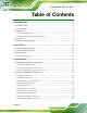 KINO-QM670 Mini-ITX SBC List of Tables Table 1-1: Technical Specifications..............................................................................................8 Table 3-1: Peripheral Interface Connectors ...............................................................................16 Table 3-2: Rear Panel Connectors ..............................................................................................16 Table 3-3: Audio Connector Pinouts ...................................................