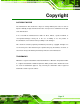 Copyright COPYRIGHT NOTICE The information in this document is subject to change without prior notice in order to improve reliability, design and function and does not represent a commitment on the part of the manufacturer. In no event will the manufacturer be liable for direct, indirect, special, incidental, or consequential damages arising out of the use or inability to use the product or documentation, even if advised of the possibility of such damages.