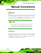 NANO-9453 EPIC Motherboard Manual Conventions WARNING! Warnings appear where overlooked details may cause damage to the equipment or result in personal injury. Warnings should be taken seriously. Warnings are easy to recognize. The word “warning” is written as “WARNING,” both capitalized and bold and is followed by text. The text is the warning message. A warning message is shown below: WARNING: This is an example of a warning message.