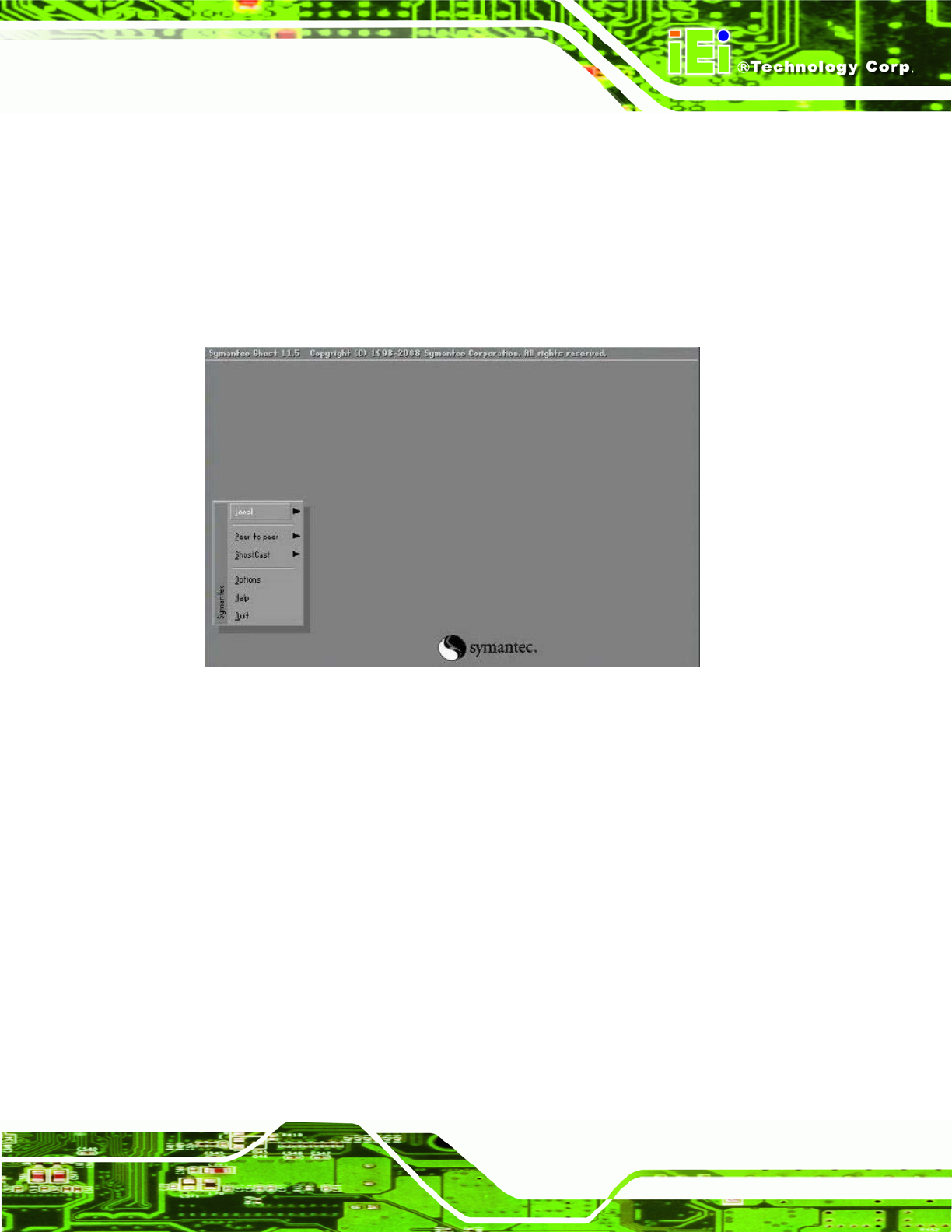 Step 2: The Symantec Ghost window appears. Use the Ghost program to backup or