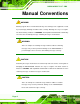 NOVA-945GSE 5.25” SBC Manual Conventions WARNING! Warnings appear where overlooked details may cause damage to the equipment or result in personal injury. Warnings should be taken seriously. Warnings are easy to recognize. The word “warning” is written as “WARNING,” both capitalized and bold and is followed by text. The text is the warning message. A warning message is shown below: WARNING: This is an example of a warning message.