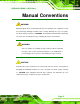 PCIE-Q350 PICMG 1.3 CPU Card Manual Conventions WARNING! Warnings appear where overlooked details may cause damage to the equipment or result in personal injury. Warnings should be taken seriously. Warnings are easy to recognize. The word “warning” is written as “WARNING,” both capitalized and bold and is followed by text. The text is the warning message. A warning message is shown below: WARNING: This is an example of a warning message.