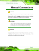 PCIE-Q350 PICMG 1.3 CPU Card Manual Conventions WARNING! Warnings appear where overlooked details may cause damage to the equipment or result in personal injury. Warnings should be taken seriously. Warnings are easy to recognize. The word “warning” is written as “WARNING,” both capitalized and bold and is followed by text. The text is the warning message. A warning message is shown below: WARNING: This is an example of a warning message.