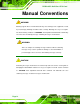 PCISA-9652 Half-Size CPU Card Manual Conventions WARNING! Warnings appear where overlooked details may cause damage to the equipment or result in personal injury. Warnings should be taken seriously. Warnings are easy to recognize. The word “warning” is written as “WARNING,” both capitalized and bold and is followed by text. The text is the warning message. A warning message is shown below: WARNING: This is an example of a warning message.