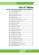 List of Tables Table 1-1: ROCKY-3786EV Model Variations ...........................................................16 Table 1-2: Technical Specifications ..........................................................................19 Table 2-1: Power Consumption .................................................................................34 Table 3-1: Peripheral Interface Connectors..............................................................39 Table 3-2: Peripheral Interface Connectors...................