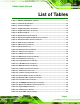 ROCKY-3786EV CPU Card MODEL NAME List of Tables Table 1-1: ROCKY-3786EV Model Variations.............................................................................13 Table 1-2: Technical Specifications............................................................................................16 Table 2-1: Power Consumption...................................................................................................30 Table 3-1: Peripheral Interface Connectors .......................................