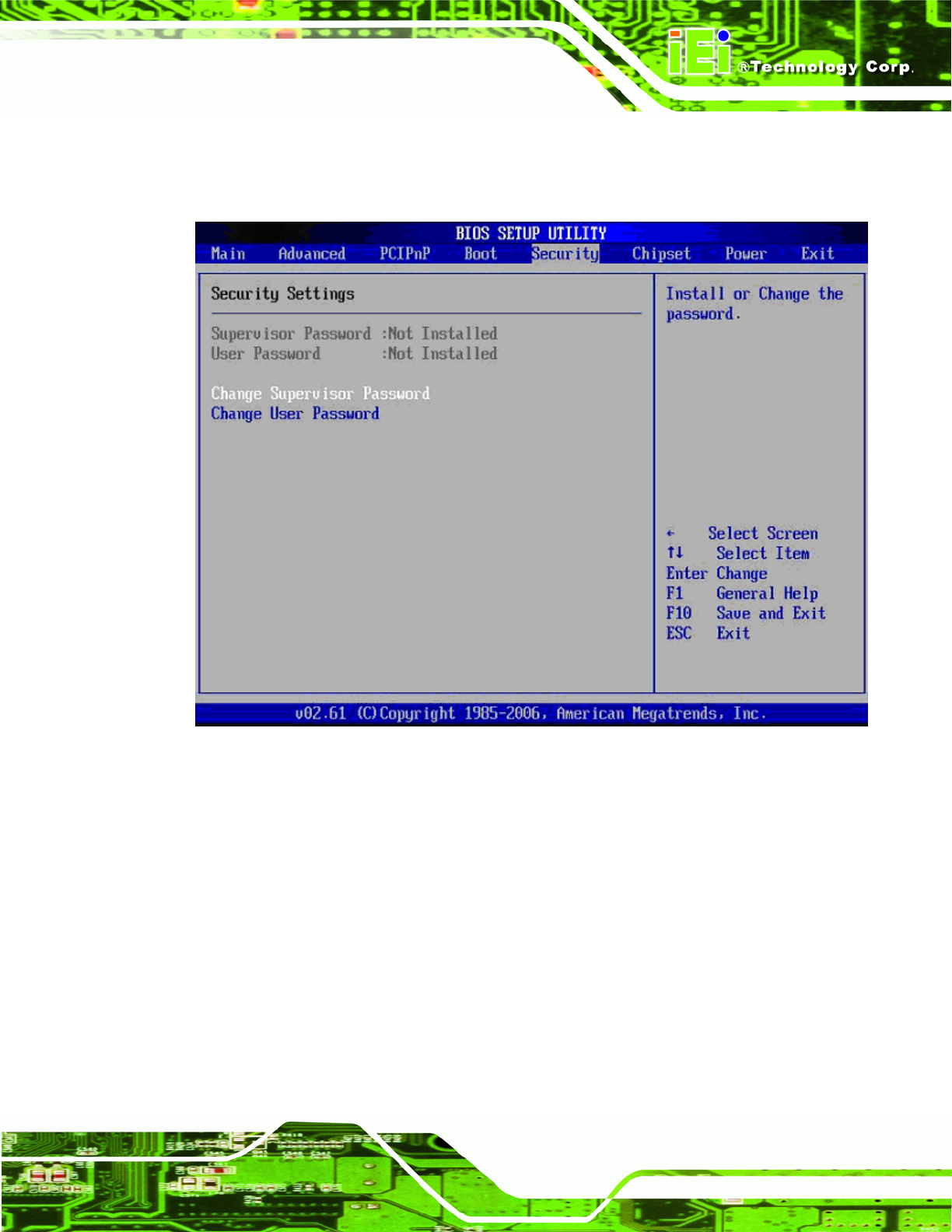 Use the Security menu (888H848HBIOS Menu 17) to set system and user passwords.
