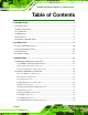 WAFER-CV-D25501/N26001 3.5" Motherboard List of Tables Table 1-1: WAFER-CV-D25501/N26001 Model Variations ...........................................................2 Table 1-2: WAFER-CV-D25501/N26001 Specifications ...............................................................8 Table 2-1: Packing List.................................................................................................................12 Table 2-2: Optional Items..................................................................