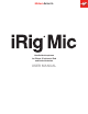 Deutsch iRig Mic Im Lieferumfang enthaltenes Zubehör: • iRig Mic Etui • iRig Mic Klammer • Gewinde-Adapter 5/8” auf 3/8” iRig Mic Features • Ideal für alle Vokalanwendungen - von Gesangs- und Sprachaufnahmen • Geeignet für alle Arten von Audioaufnahmen und -bearbeitung mit jeder Audio-App • Hochwertige unidirektionale Kondensator-Elektret-Mikrofonkapsel mit Nierencharakteristik • Dualer Mini-Anschluß ermöglicht Echtzeit-Monitoring auf Kopfhörern, Lautsprechern, Mixern, PAs usw • Robustes, st
