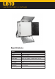 LB5 Lyra Bi-Color LED Half x 1 Soft Light Specifications Specs Head Type Rating Light Source Power Supply Lens Beam Angle Yoke & Pin Fixture Size Fixture Weight Bi-Color 5600K-3200K 51w ; 14-18VDC 510 0.2 watt LEDs Input: 110-220VAC ; Output:15VDC @ 5.0A ½ Stop, Soft Diffusion 110° 30° Angled yoke w/ Baby 5/8” & 11/8” Combo Pin 14 x 8 x 3 In.