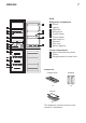 ENGLISH 7 KYLD 9 1 2 3 9 8 1 9 4 5 6 7 10 11 12 13 Refrigerator compartment 1 Shelves 2 Lighting 3 Bottle rack 4 Rating plate 5 Crisper drawer 6 Crisper divider 7 Reversibility kit 8 Separator 9 Door trays 10 Balcony egg tray Freezer compartment 11 Upper basket (freezing zone) 12 Shelves 13 Storage baskets for frozen food 12 13 Accessories Freezer block Handles 1x 1x Ice tray 2x The refrigerator accessories must not be placed in a dishwasher.
