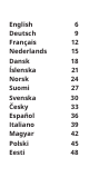 English Deutsch Français Nederlands Dansk Íslenska Norsk Suomi Svenska Česky Español Italiano Magyar Polski Eesti 6 9 12 15 18 21 24 27 30 33 36 39 42 45 48