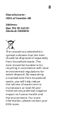 Manufacturer: IKEA of Sweden AB Address: Box 702 SE-343 81 Älmhult SWEDEN The crossed-out wheeled bin symbol indicates that the item should be disposed of separately from household waste. The item should be handed in for recycling in accordance with local environmental regulations for waste disposal. By separating a marked item from household waste, you will help reduce the volume of waste sent to incinerators or land-fill and minimize any potential negative impact on human health and the environment.